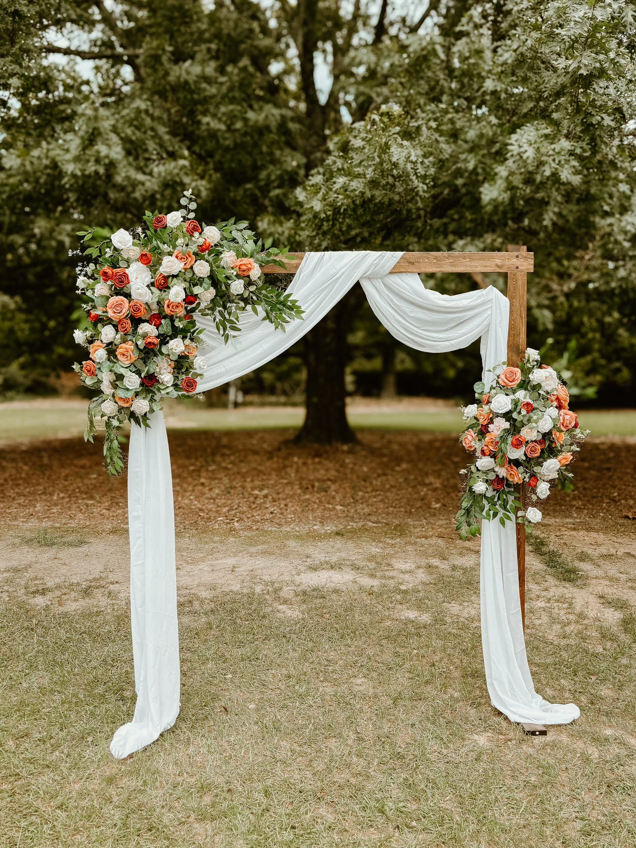 Rustic wooden wedding arch decorated with white fabric and colorful flowers, set in an outdoor area with trees in the background.