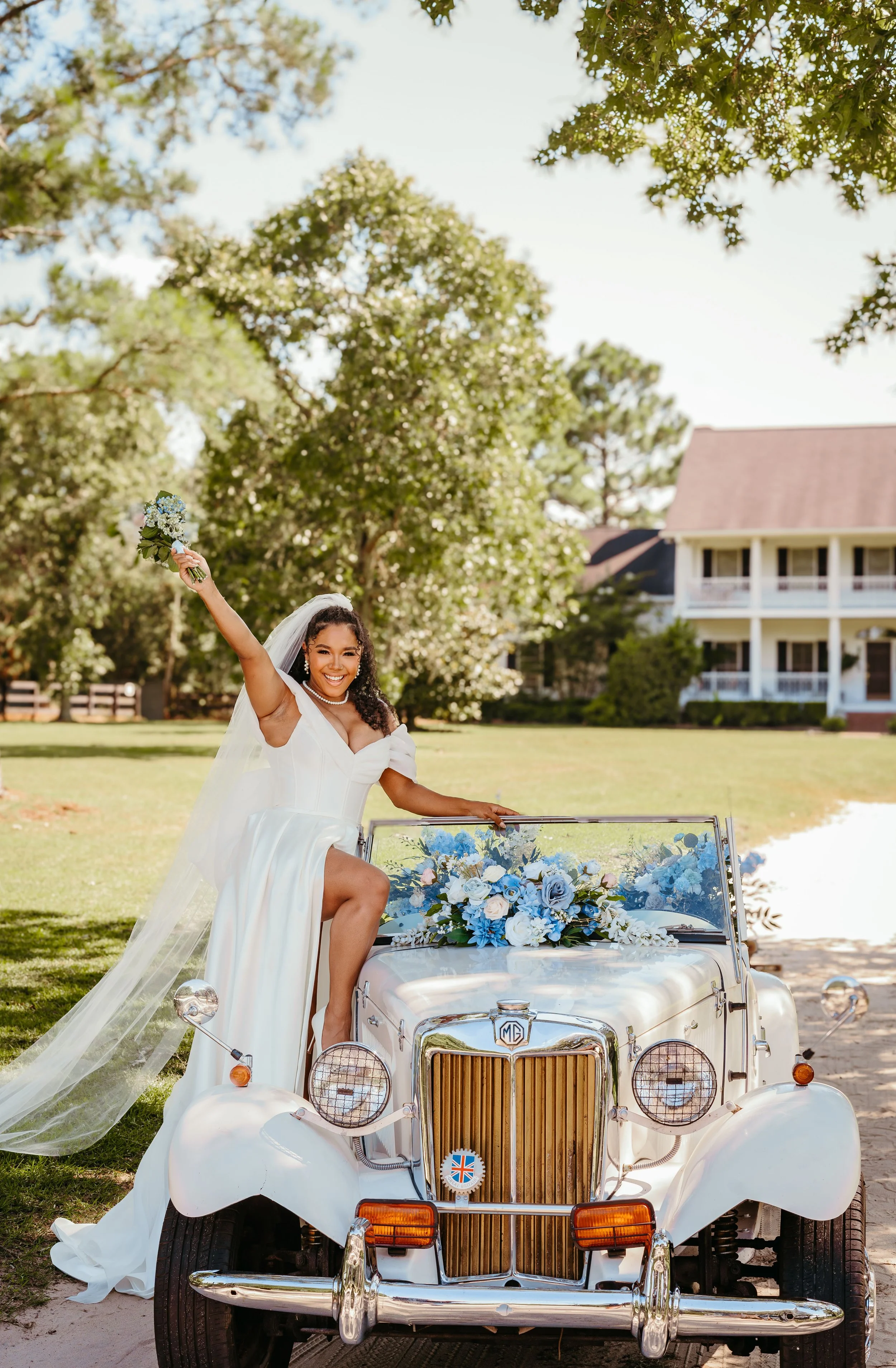 Bride in a wedding dress sitting on a classic white convertible adorned with blue and white flowers, posing with a bouquet, in front of a house with green trees in the background.