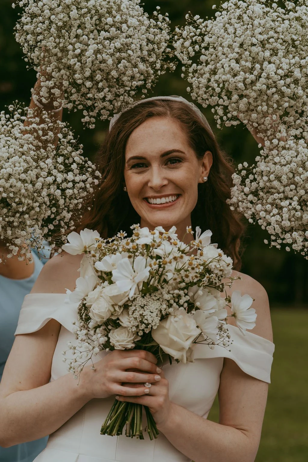 Bride holding bouquet of white flowers, smiling on her wedding day, surrounded by baby's breath bouquets.